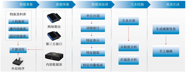 形成一套適合用于公安隊伍的可行的情報挖掘甄別輔助系統(tǒng),可高效地管理來自網(wǎng)絡(luò)及內(nèi)部數(shù)據(jù)庫的輿情信息,監(jiān)控重大事件輿情,發(fā)現(xiàn)危害輿情信息,并自動對輿情信息進行分類,有效提高信息化工作水平??傮w流程如下圖: